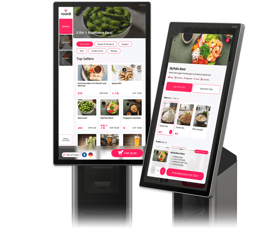 The Yoordi Self Order Terminal is a professional self-ordering kiosk specifically designed for the hospitality industry. Robust touchscreen, integrated card reader and TWINT, compact design.